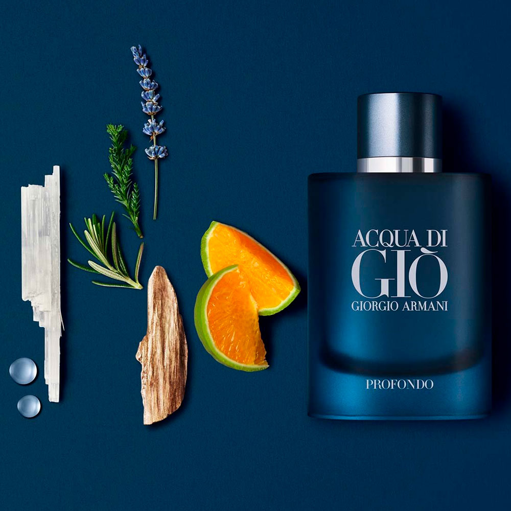 Acqua di Giò Profondo es la interpretación marina intensa; se trata de una cautivadora inmersión en la profundidad del alma, que abraza los valores de la libertad, la sensorialidad y la masculinidad moderna para revelar una dimensión cada vez más íntima.