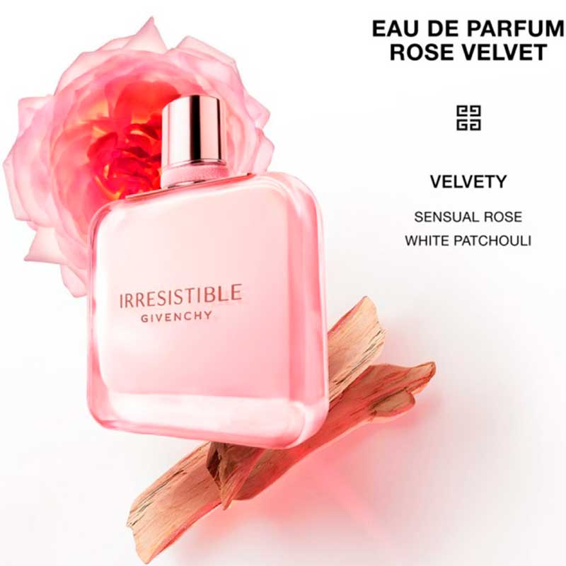 Velvety Rose está envuelta en pachulí blanco para crear el adictivo perfume floral para mujer, Givenchy Irresistible Rose Velvet Eau de Parfum. Con una infusión de notas de iris y madera tierna, esta fragancia revela la feminidad de la rosa, la nota distintiva de Irresistible. La ternura es la nueva audacia.
