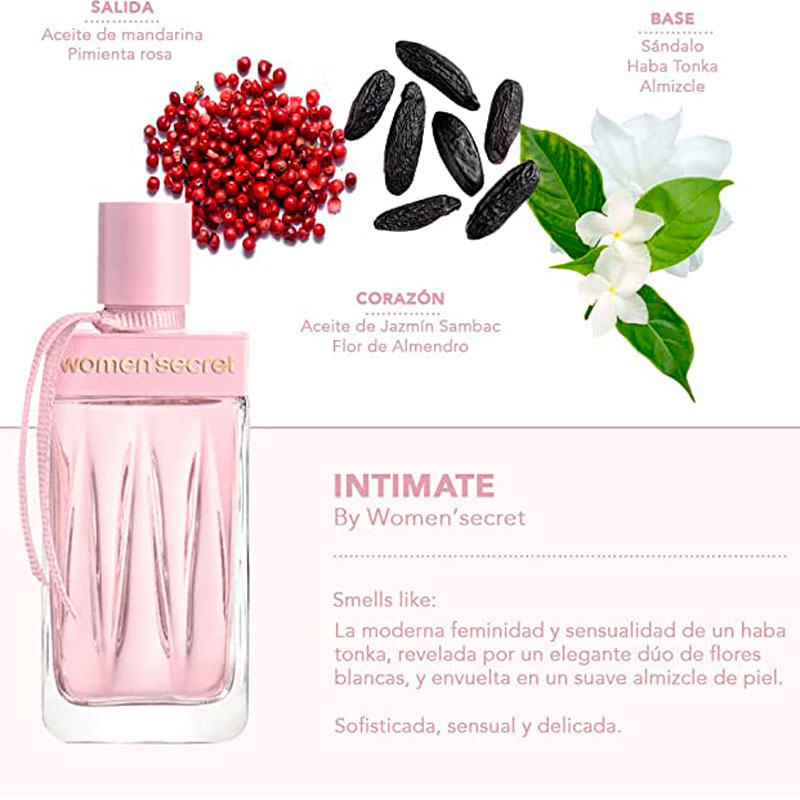Intimate, el nuevo perfume de Women’Secret es una creación moderna y romántica, firmada por el perfumista Jerôme di Marino, que abre con una salida de mandarina y pimienta rosa hasta conducir a un corazón elegante de jazmín y flor de almendro. Este bouquet de flores blancas se fija a la piel con la sensualidad del haba tonka y una delicada nota de musk.